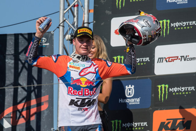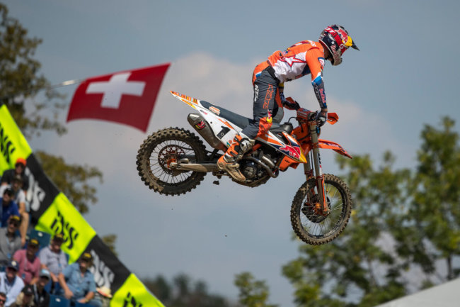 Foto: Ray Archer | KTM Images Latvijas motosporta zvaigzne Pauls Jonass atgriezies uz uzvaru takas – pēc pieciem braucieniem, kuros viņš palika ārpus labāko trijnieka, šodien Šveices GP pirmajā braucienā MX2 klasē Jonass sacensību gaitā apdzina savu galveno konkurentu Horhi Prado un izcīnīja pirmo vietu. Tomēr otrajā braucienā Prado atkal bija ātrākais, Jonasam ierindojoties otrajā…
