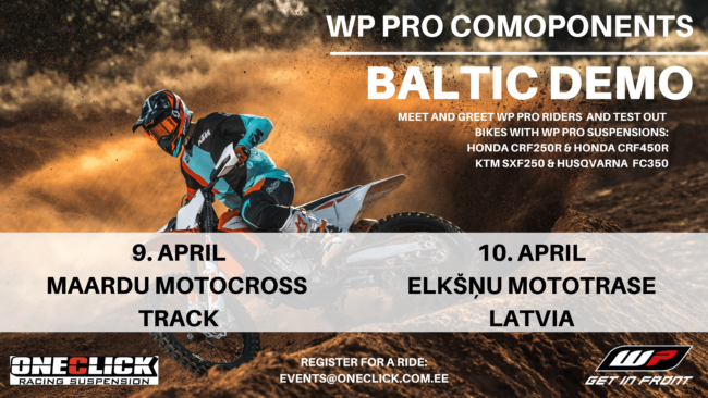 Wp Scandinavia and OneClick Racing Suspension presents: WP Pro Components BALTIC DEMO test-days! Dear riders! Now it is a great chance to test WP pro suspensions on 4 different motorcycles : HONDA CRF250R, HONDA CRF450R, KTM SXF250, HUSQVARNA FC350. WP Pro Components BALTIC DEMO test-days will be held on 9th of April on MAARDU MOTOCROSS…