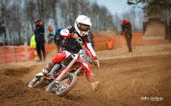 #92 Toms Macuks / Foto: Māris Stiprais Aizputē, “Misiņkalna” mototrasē aizvadīts Latvijas motokrosa čempionāta 1. posms, kurā kopā pie starta barjeras stājās 206 sportisti. Prestižajā MX1 klasē abos braucienos nepārspēts palika Toms Macuks, kļūstot par posma uzvarētāju. MX2 klasē ātrākais bija Edvards Bidzāns, bet blakusvāģu ieskaitē triumfēja brāļi Daniels un Bruno Lielbārži. MX1 klasē abos braucienos…