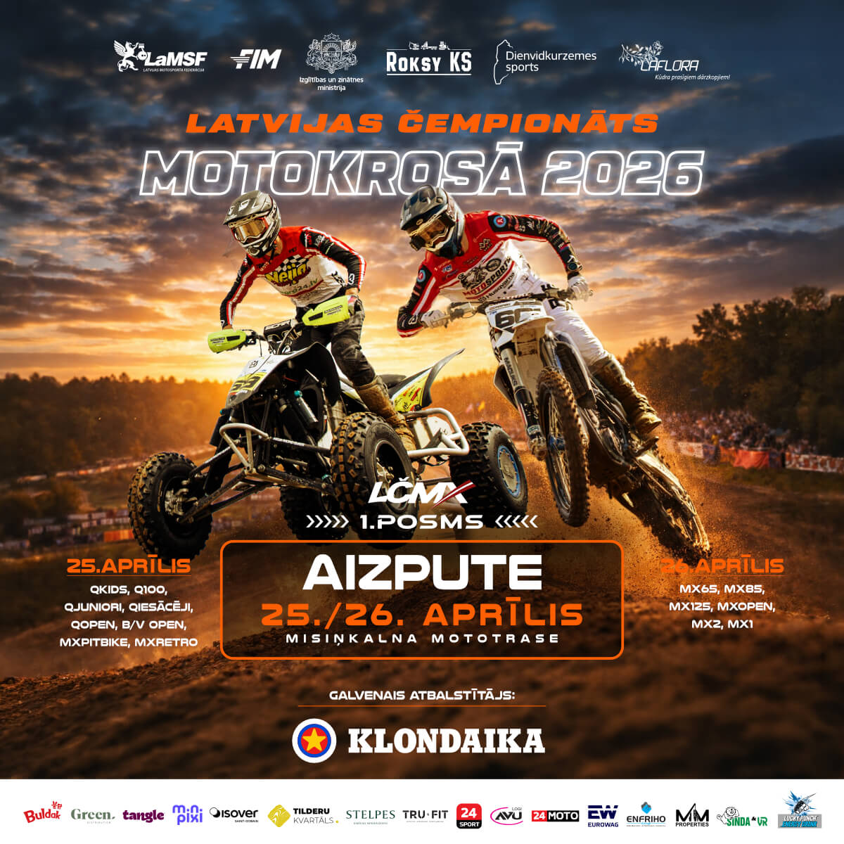 Sestdien, 25. aprīlī (starts plkst. 10:25): Uz starta līnijas stāsies jaudīgie blakusvāģi (B/V Open) un kvadracikli (Q Open). Paralēli norisināsies Latvijas kauss motokrosā, kurā startēs plašs dalībnieku klāsts: no visjaunākajiem braucējiem (Q Kids, Q 100, Q Juniori) līdz pieredzējušiem meistariem (Q Veterāni, Q Amatieri, MXRetro, Pitbike un citas klases).