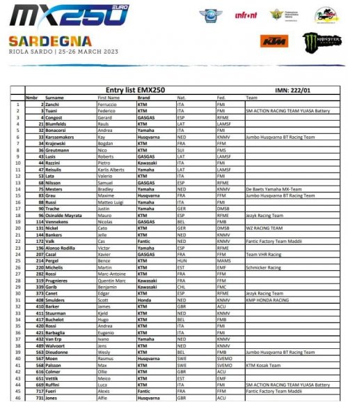 Sardīnijas posmam, ieskaitot latviešus, pieteikti 46 motokrosa motociklu piloti no dažādām Eiropas valstīm. “Riola Sardo” ir labi pazīstama trase motokrosa braucēju vidū, jo tā ir regulāra slavenā “Internazionali d’Italia” pieturvieta un nu jau trešo gadu ir iekļauta arī MXGP kalendārā.