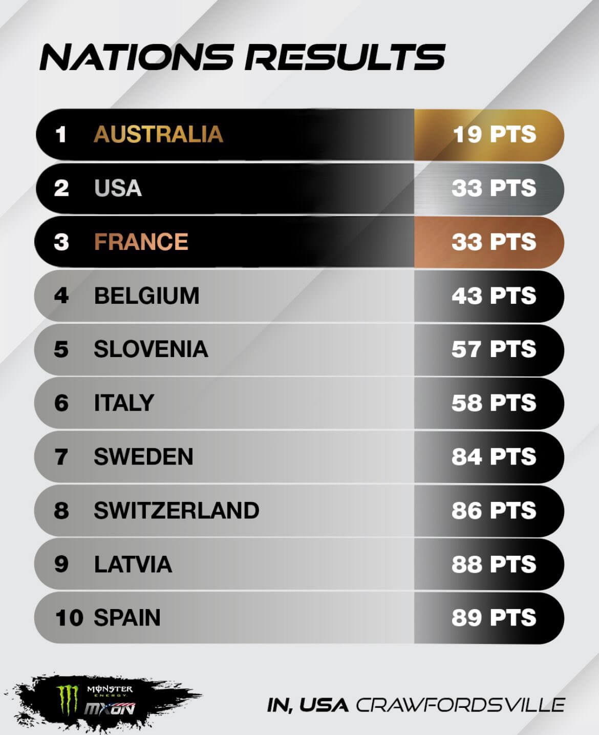 Noslēdzošajā braucienā, kur trasē devās MXGP un MXOpen klašu sportisti, Pauls Jonass izcīnīja 17. vietu, bet Kārlis Alberts Reišulis finišēja 24. pozīcijā. Cīņa par katru punktu bija ļoti sīva – pēdējos apļos Latvijas sportisti nedaudz atkrita, un tas izšķīra pozīcijas kopvērtējumā. Beigu rezultātā Slovēnija, Zviedrija un Šveice Latviju apsteidza tikai par dažiem punktiem, taču mūsu sportisti pārspēja Spānijas izlasi, kuras pārstāvis Rubens Fernandess piedzīvoja kritienu un izstājās.