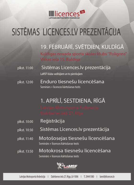 Details1.aprīlī Latvijas Motosporta federācijas telpās (LaMSF), Dzērbenes ielā 27, Rīgā, norisināsies LaMSF motošosejas un motokrosa tiesnešu seminārs. Tā laikā dalībnieki tiks iepazīstināti arī ar jauno licencēšanās sistēmu – licences.lv. Aicinām piedalīties. Dienas kārtība pieejama ŠEIT
